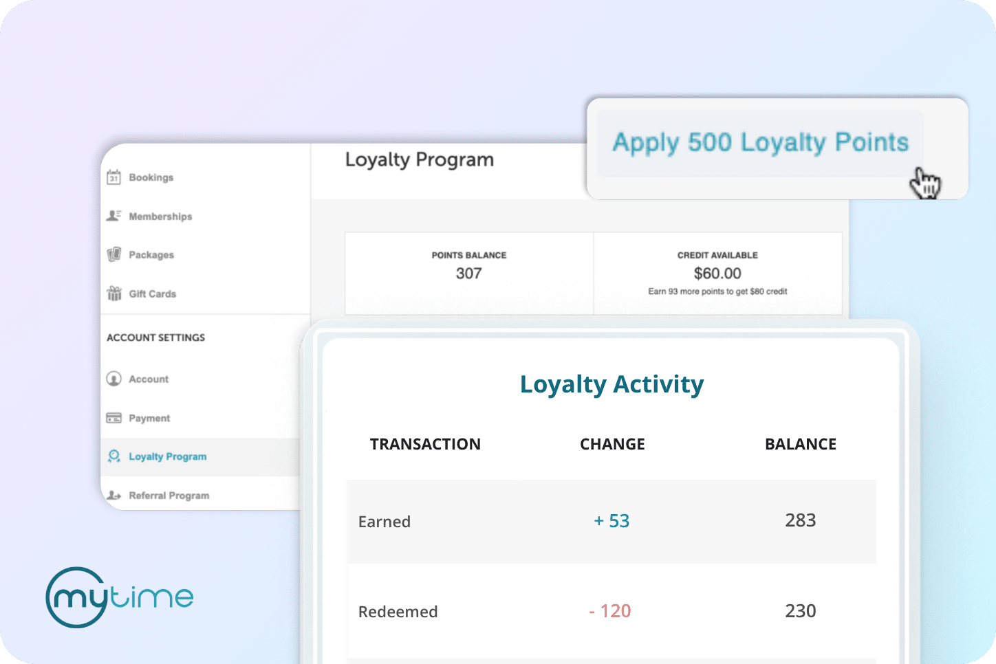 - Tracking Loyalty Usage: Monitoring the success of a loyalty program requires advanced reporting tools. On each client profile, MyTime audits any changes to a customer’s loyalty points, removing any potential for confusion or impropriety. An in-depth activity report details the program’s performance, including how points are being earned and redeemed. Companies can use these insights to identify top spenders, measure the program’s effectiveness, and make adjustments to align with customer preferences.